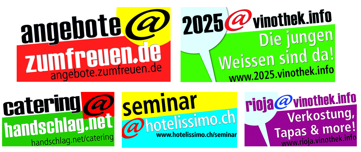 Die gezeigten Beispiele sind in Form und Farbe "frei". Grafische Gestaltung folgt immer den Wünschen unserer Kunden. Sie sehen einige unserer aktuellen e Mail Adressen und SubDomains, die viele attraktive Lösungen möglich machen ... |